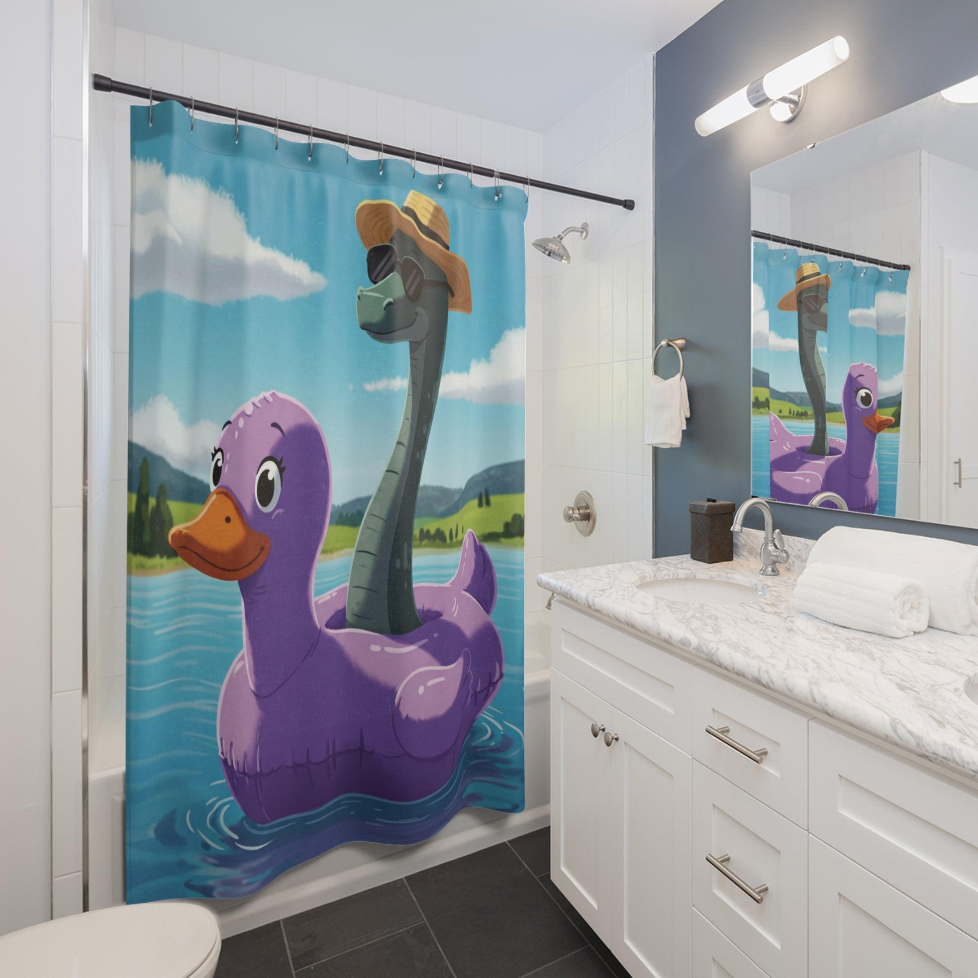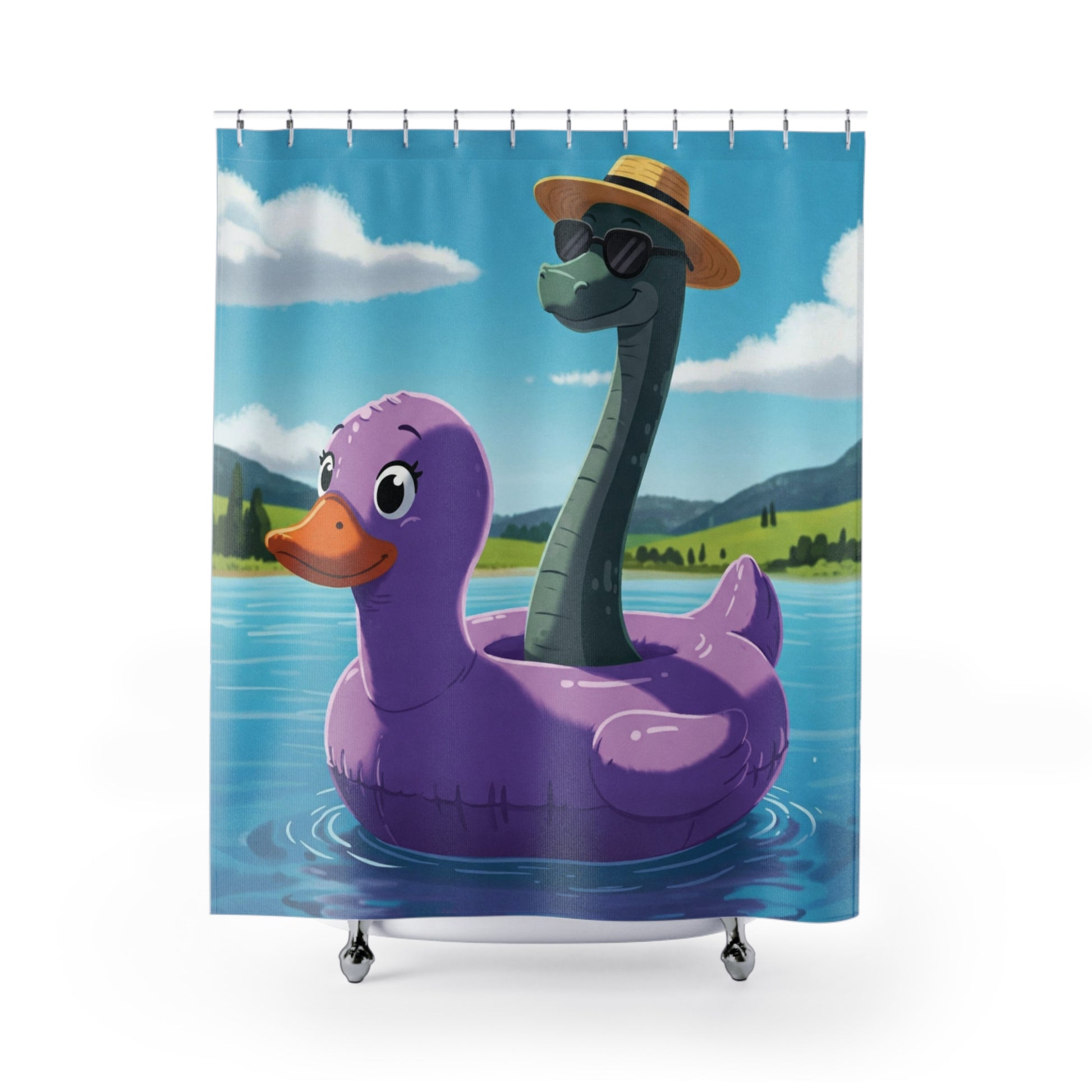 Transform your bathroom into a whimsical retreat with this eye-catching shower curtain. Featuring vibrant artwork of a playful Nessie in a Duck floaty, this curtain adds a fun and lighthearted vibe to your space. It’s not just a functional item; it’s a statement piece that brings joy to daily routines. Perfect for those who love unique décor, it’s ideal for families, kids, or anyone looking to infuse their bathroom with personality. Great for holidays like or just for adding a splash of color to your home year-round!